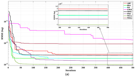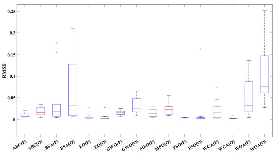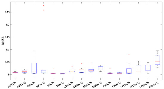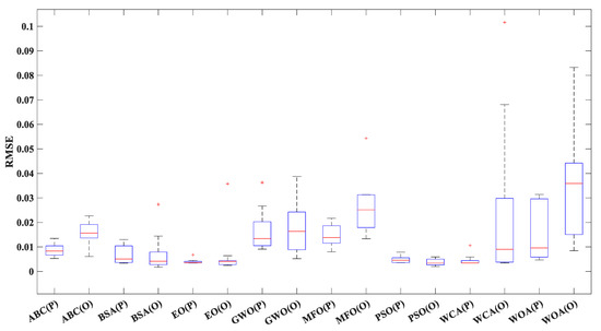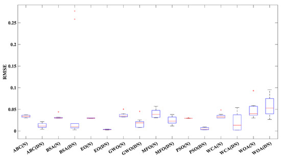Considering the impact of two different training data on the results, Figure 9 shows the boxplot of the RMSE distribution obtained by MhAs. It is obvious that after data noise reduction, the upper and lower bounds of the RMSE obtained by each algorithm or the RMSE median have decreased to a certain extent, and the RMSE outlier obtained by BSA, MFO, and WOA has disappeared. This sufficiently demonstrates that de-noising based on RBF data can significantly improve the accuracy and stability of MhAs in parameter extraction.