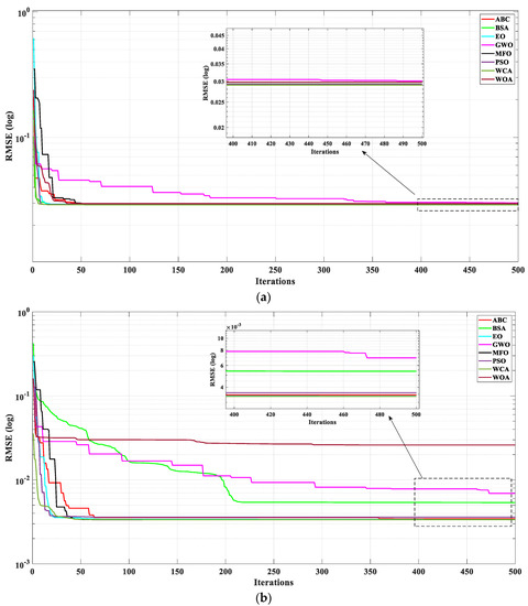 Convergence curves of RMSEs obtained by MhAs for SDM under original data and predicted data. (a) predicted data and (b) original data.