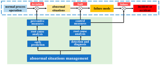 Abnormal situation management (ASM) is mainly achieved through the early prediction and identification of abnormalities, timely diagnosis of the root cause of abnormalities, and appropriate preventive and control measures to prevent abnormalities from evolving into incidents or accidents, as shown in Figure 1. Its purpose is to restore the chemical process to a normal state when process parameters have been deviated from, but they have not yet triggered a safety shutdown or led to other serious consequences. Over the past few decades, research has shown that effective ASM can protect chemical process systems from harm and reduce the likelihood of incidents or accidents [6]. Therefore, ASM is an important means of strengthening chemical process safety management (PSM) and risk control, attracting wide attention from industry and academia.