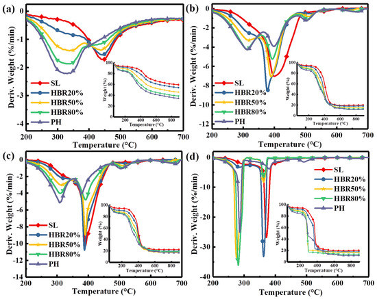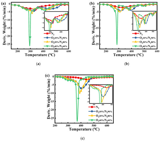 Figure 2 shows the comparison of the derivative weight loss of pure PN, PH, and SL fuels under increased atmospheric O2 concentrations from 0 to 40%. From Figure 2a, it can be seen that after the addition of O2, the peak at 332 °C splits into two distinct peaks, which are in the ranges of 396–321 °C and 417–457 °C, respectively. As presented in Figure 2b, the pyrolysis of the PH occurs in the relatively broad temperature range of 220–510 °C with a lower weight loss rate. When O2 is involved in the reaction, the broad temperature range mainly splits into three obvious peaks due to the different oxidation reactivity of each component. Almost all of these peaks shift to lower temperatures and the peaks sharpen with the increased O2 concentration, thus showing that the reactivity of volatiles from PH is augmented by adding oxygen. From Figure 2c, compared with the DTG of PH, SL has only one peak to move to lower temperatures with the increase in O2 concentration. The SL shows higher weight loss rates than the PH in different oxidation atmospheres due to the simultaneous oxidation of both volatiles and fixed carbon.