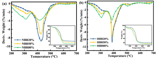 DTG−TG curves of the blend under different atmospheres: (a) N2, (b) 10%O2/90%N2, (c) 20%O2/80%N2, and (d) 40%O2/60%N2.