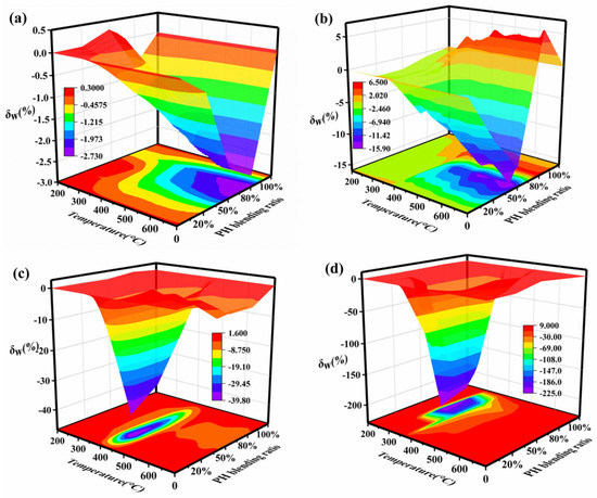 The relative deviation (δW) between the experimental TG curve and the calculated TG curve is used to express the synergistic effect of coal and humus co-combustion. When δW is close to zero, it indicates that the experimental and calculated values are not significantly different and that there is a limited synergistic effect from blend co-combustion. When δW is positive, PH and SL co-combustion appears as a negative synergy, and when δW is negative, it is a positive synergy. The relative deviations with respect to TG curves of the blends in four atmospheres are shown in Figure 5. It is observed that the peak of δW dramatically increases by about 80 times with an increased O2/N2 atmosphere. The peak of δW is extremely significant in the range of 600–700 °C under an N2 atmosphere, 550–680 °C under a 10%O2/90%N2 atmosphere, 390–450 °C under a 20%O2/80%N2 atmosphere, and 300–340 °C under a 40%O2/60%N2 atmosphere. Obviously, with an increased O2 content, the temperature ranges of peaks gradually shift to the low-temperature zone. This suggests that the addition of more oxygen leads to the early occurrence of synergy. The oxygen-rich atmosphere is beneficial to activating the carbonaceous deposits covering the surface of particles, thus accelerating decomposition and facilitating mass transfer. With the increased O2 content, the blending ratio corresponding to peak value declines from 80% to 20%, but the optimal blending ratio is about 50% under a 40%O2/60%N2 atmosphere. It is apparent that the coupling interactions of composite factors (the blending ratio and oxygen content) lead to the nonlinear variation in the synergistic effect. This indicates that both the oxygen concentration and blending ratio play a vital role in synergistic interactions between PH and SL. Due to the different sensitivity of the fuels to oxygen, PH volatiles clogged in the gap between particles and attached to the particle’s surface at lower temperatures can be decomposed earlier. Hence, the ratio of biomass in blended fuel can be increased by properly increasing the oxygen concentration in co-combustion, which can reach an optimal degree of synergistic effect.