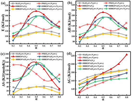 To help better understand the co-combustion of the blend, the thermodynamic parameters (ΔH, ΔS, and ΔG) based on the Eα values are obtained by KAS methods. Figure 7 shows the Eα, ΔH, ΔS, and ΔG versus α for the samples under different atmospheres. For example, under the oxygen-rich atmosphere, the Eα of the blend (HBR20%) increases from 111.27 to 175.67 kJ/mol (0.2 < α < 0.5); when α is greater than 0.5, Eα begins to decrease and finally reaches 132.33 kJ/mol (Figure 7a). Table 6 lists the thermodynamic parameters of partial samples in the four atmospheres. The Eα value first decreases and then increases with the increased O2 concentration. The vital factors affecting the reaction activation energy could be the reduced concentrations of active molecules, the limitation of diffusion, and the involvement of organic impurities [53]. The heat released from the oxidation of the char soars with the O2 concentration, promoting the thermal effect during co-combustion. The actual energy required for the combustion process is enhanced due to the increased crystal size and ash content of char. In the present study, the results show that E reaches its minimum in the O220%/N280% atmosphere.