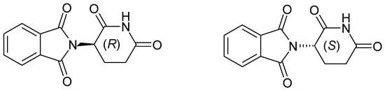 Thalidomide ((RS)-2-(2,6-dioxopiperidin-3-yl)isoindole-1,3-dione) (Figure 1) is one of the compounds with phthalimide scaffold. The teratogenic effects observed in humans with thalidomide were attributed to the S-enantiomer, acting on protein Cereblon [3], whereas the R-enantiomer was found to induce sedative-hypnotic activities. Despite its association with teratogenicity [4], thalidomide has gained attention for its immunomodulatory and antiangiogenic properties and is currently used to treat certain cancers like multiple myeloma and complications of leprosy.