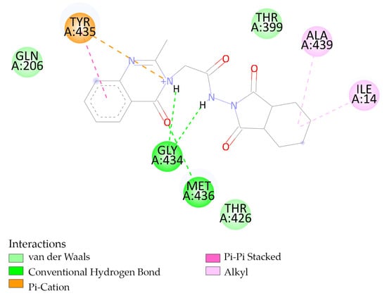 Compound 1b forms conventional hydrogen bond interactions with amino acid (AA) residues GLY 434 and MET 436 of MAO-B (Figure 3). The interactions between the rest of the compounds and NF-KB, COX-2, and MAO-B are presented in the Supplementary Materials files (Figures S10–S17 from Supplementary Materials).