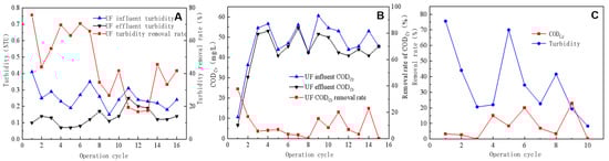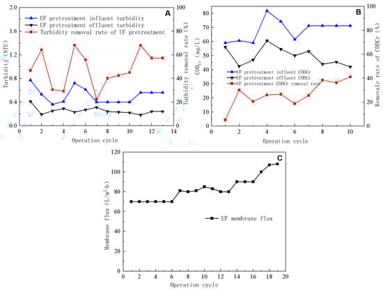 Removal efficiency of turbidity by ultrafiltration pretreatment (A), impact of ultrafiltration pretreatment on CODCr removal efficiency (B), and ultrafiltration flux (C).