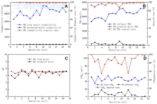 Conductivity reduction (A), TDS removal efficiency (B), pH level of inlet and outlet water (C), and CODCr removal efficiency (D) of reverse osmosis.