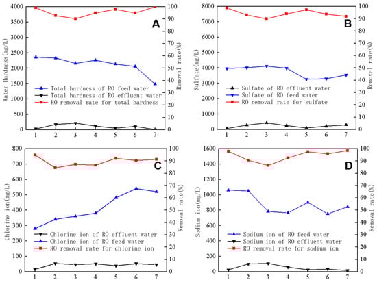 Removal efficiency of total hardness (A), SO42− (B), Cl− (C), and Na+ (D) by reverse osmosis.