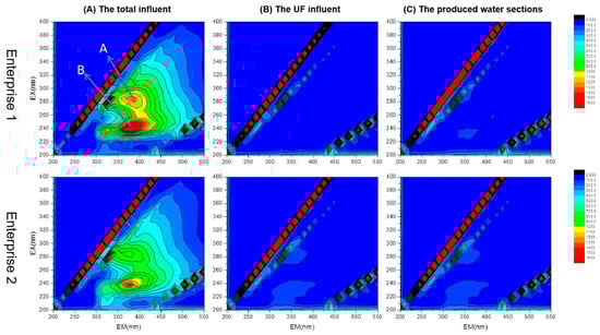 Figure 7 shows the EEM plots for water samples corresponding to two different times (1, 2) of secondary treatment effluent from Enterprise 1; these reflect the total influent, UF influent, and produced water sections. The two water samples exhibited two distinct fluorescence peaks, A and B, centered at λEx/λEm = 280/340 to 350 nm and λEx/λEm = 230/350 nm, respectively; peak B is the main peak and peak A is the second strongest peak. The fluorescence peak intensity ratios (Peak A/Peak B) were 0.635 and 0.658, respectively. These results differed from the characteristic peaks of municipal wastewater because the substances represented by the characteristic peaks of municipal wastewater were protein-like, whereas industrial wastewater mainly contained non-protein-like substances (e.g., aromatic compounds). As a result, their characteristic peaks were markedly different, indicating that titanium dioxide wastewater demonstrates typical industrial wastewater characteristics with low concentrations of protein-like substances. This can mitigate membrane contamination caused by proteins in the dual-membrane process [].
