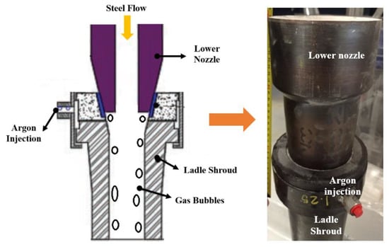 The Ladle Shroud is an essential device in modern steelmaking, separating the molten steel from the ambient atmosphere and thereby attempting to protect steel from being re-oxidized during its transfer from the ladle into the tundish. The connection between the ladle’s slide-gate nozzle, or “lower nozzle”, and the Ladle Shroud involves an overlap between the two parts. This overlap usually involves a gasket seal, as per Figure 1, through which argon is injected to displace any air. The final purpose is to avoid air suction and consequent liquid steel re-oxidation. However, it is known that air suction is a possibility, since the gauge pressure field generated within the Ladle Shroud can be expected to be negative at the lower nozzle–Ladle Shroud joint. This was noted in the early work of Wang, Lee, and Hayes [1], for example, where a negative gauge pressure (less than 1 atm) was demonstrated for a scaled water model of such a system. To avoid consequential air inhalation, argon shrouding has been adopted industrially in the hope of blocking air ingression. It has been found that depending on the ratio between the injected argon and the liquid steel flow rate, this will produce different multi-phase flow regimes within the Ladle Shroud itself. For instance, an argon shrouding flow at one-third that of the steel flow rate was found to be necessary to avoid air ingression, experimentally [2,3]. However, if the argon flow is too high, it will produce a large Tundish Open Eye (TOE) and subsequent slag entrainment, plus re-oxidation of liquid steel within the tundish. Quantitative research studies regarding these phenomena are still pending. In future, a more comprehensive study is required to address the effect of the argon flow rates and Ladle Shroud designs on liquid steel cleanliness.
