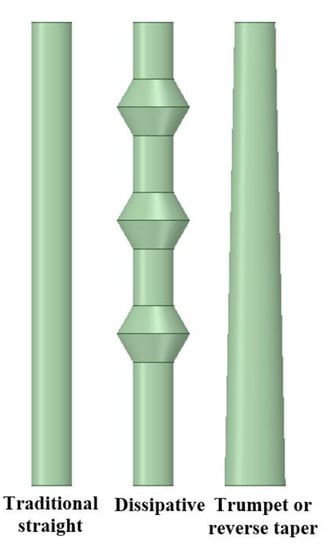 Various studies have explored some improvements in the new Ladle Shroud process, such as new designs and argon injection techniques, using mathematical and physical modelling. For example, several new Ladle Shroud designs have been proposed over the last decade [4] aside from the traditional straight tube design. Two examples of these innovative designs are the Dissipative and the Trumpet (or reverse taper) Ladle Shrouds. It has been found that a dissipative design will enhance the intermixing phenomena within the Ladle Shroud–tundish system [5,6], and a trumpet design will reduce the entering velocity and turbulence of the steel into the tundish, to reduce slag entrainment and steel splashing [6,7]. Figure 2 depicts these two shroud designs. The use of a trumpet or reverse taper Ladle Shroud has become more common in the steelmaking industry, owing to the advantages it provides over the traditional straight, constant-diameter design during ladle changes. Studies of different Ladle Shroud designs have mainly focused on the steady-state regime via physical [2] and mathematical models [3,6,7]. Only a few transient studies have been performed thus far [7,8,9], focusing on start-up and ladle change operations and their impact on fluid flows and steel quality.