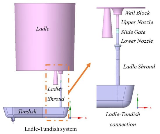 Diagram of the ladle–tundish system and close-up of the ladle–tundish connection.