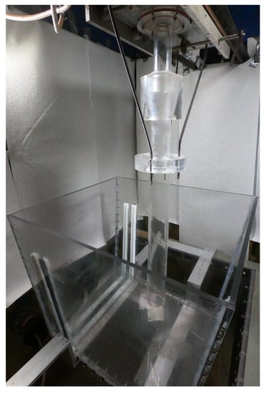 For the construction of the full-scale model, diagrams and real parts provided by the industrial partner were used to exactly replicate the dimensions and intricacies (mainly the lower nozzle–Ladle Shroud connection) of the Ladle Shroud–tundish system. It is important to mention that, to focus on the Ladle Shroud design’s transient performance, a complete water model did not have to be constructed, but only a sub-system addressing the entry flow of steel into the tundish. This was identical to the mathematical model for producing a digital twin. The resulting flow visualization will be presented for comparison with the mathematical modelling results now predicted.