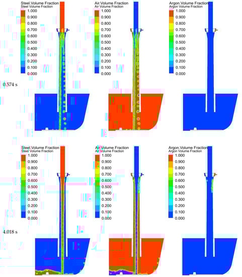 Predicted phase volume fraction contours for steel, air, and argon phases at 0.574 and 4.018 s on the symmetry plane.