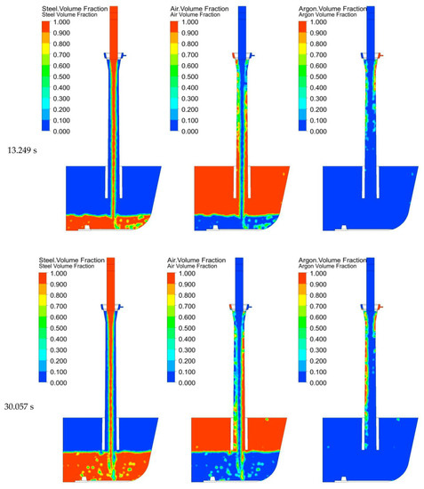 Predicted phase volume fraction contours for steel, air, and argon phases at 13.249 and 30.057 s on the symmetry plane.