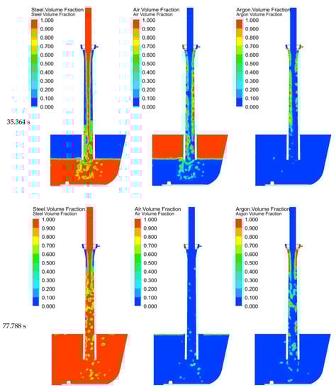 Predicted phase volume fraction contours for steel, air, and argon phases at 35.364 and 77.788 s on the symmetry plane.