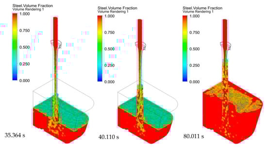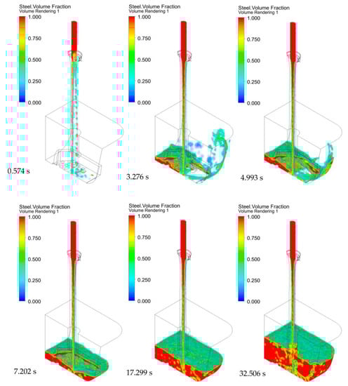To complement the previous results for the different phases on the symmetry plane, 3D visualizations of the simulation were generated via Volume Rendering, where the volume is split in 100 planes parallel to the symmetry plane to obtain an inner view of the filling stage at different time steps for the steel volume fraction only. Figure 11 and Figure 12 present these results in an isometric view towards the inside of the system, from 0.6 to 80 s. At 0.6 s, the two diverging streams can be observed again, which then stabilize into a single stream at 3.3 s. At this moment, the splashing is readily evident and dramatic, with steel droplets reaching almost to the end of the calculation zone on the vertical +y axis. This can partly be attributed to the effect of the turnflow during the initial time steps, as its walls redirect the liquid steel into the back part of the entering zone, generating splashing mainly on the right-hand side. Afterwards, at 5 s, the splashing height diminishes, as the flow then becomes more quiescent at 7.2 s, where gas (air) bubbles start to become present within the liquid steel. At 17 s, the presence of gas bubbles is more evident, and at 32.5 s, gas bubbles extend widely throughout the liquid steel in the tundish entry zone, with some bubbles even reaching the back wall of the tundish. At the same time, the single falling steel stream “breaks”, generating turbulent intermixing of the phases inside the Ladle Shroud. Figure 12 presents the predicted 3D steel fraction volume rendering at 35 s, 40 s, and 80 s. As the steel level keeps rising within the Ladle Shroud, (around 8.5 inches in height at 35 s), the gas bubbles start to be confined near the exit zone and are less extended within the liquid steel, as the flow within the Ladle Shroud starts to present high intermixing between the three phases, confining the gas bubbles mainly within the Ladle Shroud. Then, at 40 s, this effect increases, as a highly turbulent flow is constrained to gradually fill the Ladle Shroud. By 80 s, when the steel level reaches 16 inches, a predominantly bubbly argon–liquid steel flow regime is predicted, with the presence of large argon bubbles along the Ladle Shroud, under quasi–steady state operations. The size of these argon bubbles is around 15 mm diameter. These, when exiting the Ladle Shroud, and rising to the liquid steel surface within the tundish, can be expected to disturb the overlaying 1.5-inch slag layer. This, in turn, can promote slag entrainment in the form of small inclusions, as demonstrated earlier experimentally and numerically [8,9,15].