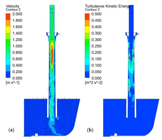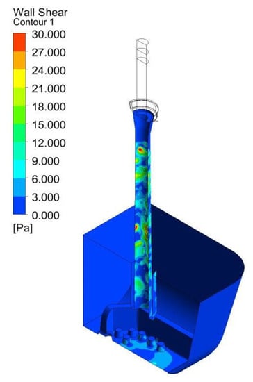 Figure 13 shows the predicted velocity and turbulence kinetic energy contours at 80 s on the symmetry plane under quasi–steady state operation. The velocity field (see Figure 13a predicts an important acceleration of the flow in the zone where the falling steel stream encounters the perpendicular argon injection. The stream then progressively slows until reaching an exit velocity from the Ladle Shroud at around 0.5 m/s. Therefore, the Ladle Shroud design fails to decelerate the steel flow markedly, which is the main purpose of the diverging ID Ladle Shroud design. The turbulence kinetic energy contour (see Figure 13b shows a high turbulence zone at the top part of the Ladle Shroud (maximum values of 0.5 m2/s2) due to the interaction between the liquid steel and the argon injection. This will lead to wall shear stress values of around 15–30 Pa on the Ladle Shroud wall, according to Figure 14, generating higher wall shear stress on the Ladle Shroud walls than on the turnflow walls, where values of 3 to 6 Pa are predicted. Through the analysis of the results of the “real case”, the following results can be extracted: