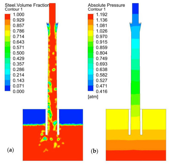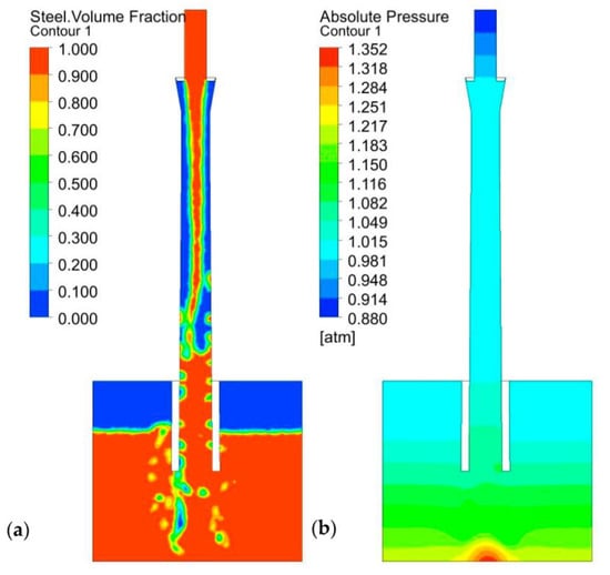 Predicted contours for (a) steel volume fraction and (b) absolute pressure at 41.853 s on the symmetry plane.