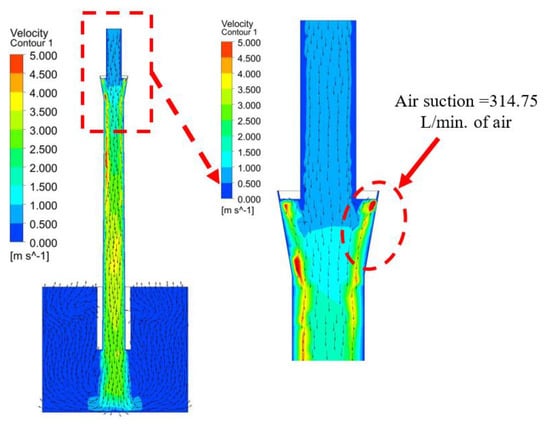 Predicted velocity contour with vectors and detail at the lower nozzle–Ladle Shroud joint at 42.154 s on the symmetry plane.