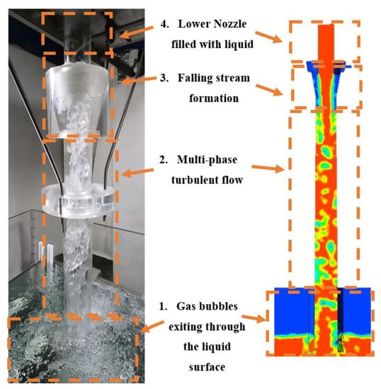 In 2019, Singh and Mazumdar [3] used the VOF multi-phase model to predict the steel–argon flow within the Ladle Shroud and compare this with previously published experimental results [2]. The model was validated extensively with experimental measurements, and the authors were able to present a correlation to predict the free jet length and the required gas flow rate to prevent air ingression. To model the turbulence flow field, the realizable k-ε model was used, and the surface tension force (Fσ) was added into the momentum equation as an extra term. The mathematical model results were compared with the water modelling experiments, where two regimes were observed. With a low gas to liquid flow (Qg/Ql = 0.025), a bubbly regime was observed, whereas when a higher gas to liquid flow (Qg/Ql = 0.2) was applied, a free steel jet regime was achieved. A gas liquid flow ratio of around Qg/Ql = 0.4 was needed to prevent any air ingression, where a full free jet was achieved within the Ladle Shroud [2].