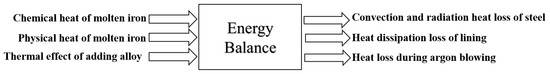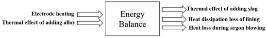 In the LF-refining process, heat is mainly generated through the heating of the electricity supply and the thermal effect of the additives, and the loss of heat is mainly generated through heat dissipation from the ladle lining and through argon blowing and stirring.