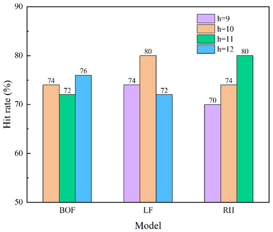 We selected the number of hidden layer nodes of the neural network model according to the formula; randomly selected 50 groups of samples from the databases of the BOF, LF, and RH models; and selected different hidden layer nodes to test the neural network model. The test results are shown in Figure 6.
