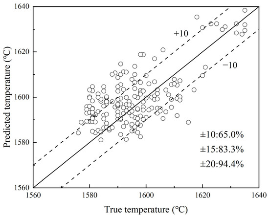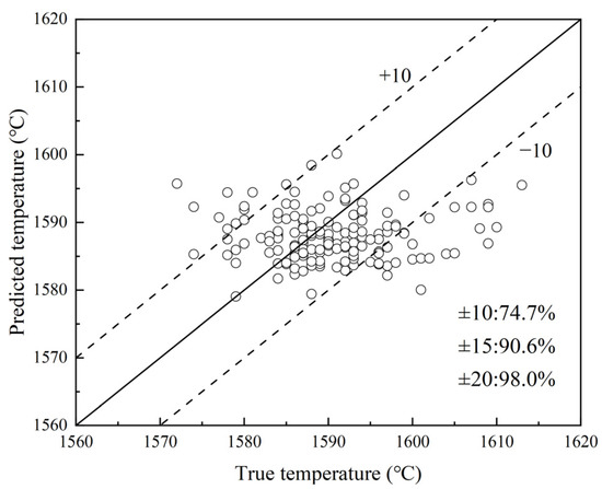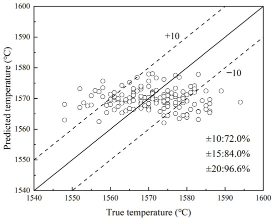 The prediction results for BOF end-point steel temperature are shown in Figure 8. By predicting the temperature of steel in the BOF stage, the prediction deviation within ±10 °C has a hit rate of 65%, that within ±15 °C has a hit rate of 83.3%, and that within ±20 °C has a hit rate of 94.4%.