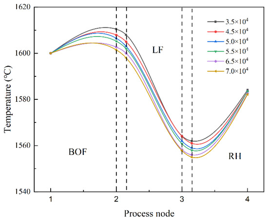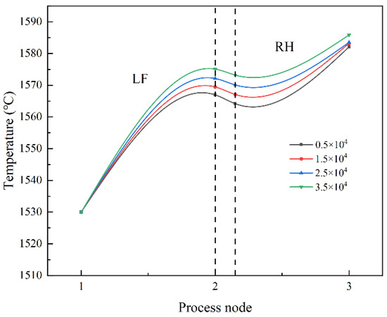 The initial temperature of the steel at the starting point of the LF stage was 1530 °C, and the steel in this furnace passed through the LF and RH refining stages in turn. In the LF refining process, arc heating is an important factor that affects the rise in the temperature of steel. Different electric energy consumption quantities were selected in order to predict the temperature of the steel.