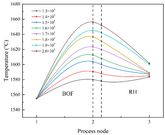 The influence of molten iron on the temperature of steel is mainly attributed to the physical heat of molten iron and the oxidation and exothermic heat of the chemical elements in molten iron. The initial temperature of the molten steel was 1555 °C. After calculation, we added different amounts of iron (1.3 × 105 kg~2.0 × 105 kg) to the converter and obtained steel temperatures of 1580.02 °C, 1590.74 °C, 1603.80 °C, 1612.37 °C, 1623.28 °C, 1636.54 °C, 1645.24 °C, and 1656.3 °C. The temperature of the steel increased by about 10 °C for every additional 1 × 104 kg of iron input.