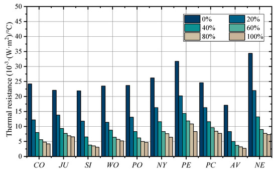 In this study, the thermal performance changes of ten different fiber types of woven fabrics were measured at various humidity levels. The measurement results of thermal resistance and insulation rate in dry and wet states are shown in Figure 2 and Figure 3; each sample was measured three times. The coefficient of variation (CV) for the measurement results was less than 3%. As shown in the figures, the fabrics deteriorated in thermal performance after wetting and the thermal resistance and insulation rate both decreased as the water content saturation level of the fabric increased. Compared with the thermal resistance of all fabrics in the ultradry state, when the water content saturation level reached 20%, the thermal resistance significantly decreased in the range of 8.3~12.1 × 10−3 m2·°C/W, with an average decrease of 42.5%. Subsequently, when the water content saturation level reached 40%, 60%, 80%, and 100%, the average decreases in thermal resistance were 61.8%, 71.5%, 74.9%, and 77.8%, respectively. It was observed that the degree of decrease in thermal resistance gradually decreased as the water content saturation level of the fabric increased; this ultimately decreased to 22.2% of the thermal resistance in the ultradry state. This may be because a small amount of water in the fabric provides a shortcut for heat transfer when the water content saturation level of the fabric is low, significantly increasing the thermal conductivity of the fabric. As the water content saturation level increases, water molecules gradually enter the interior of the fabric until all the voids in the fabric system are occupied [27]. The thermal conductivity of fabric fibers generally ranges from 0.033 to 0.100 W/(m·°C) according to literature [17]. Air, as a poor conductor of heat, has a stable thermal conductivity of only 0.026 W/(m·°C) at 20 °C, whereas the thermal conductivity of still water at 20 °C is 0.57 W/(m·°C), which is 22 times higher than that of air. The specific heat capacity of water is 3431 times that of air at 37 °C [28]. When water occupies the entire fabric system, it not only destroys the loose structure of the fabric but also significantly reduces the thermal resistance of the fabric due to its higher thermal conductivity. When a large number of water molecules are adsorbed on the surface of the fabric, the fabric surface becomes moist [29]. As the proportion of adsorbed water in the fabric increases, the impact on thermal resistance gradually becomes less significant because the adhesion force and the action force of adsorbed water are weak [10]. For blended fabrics, due to the different blending proportions of hydrophilic and hydrophobic fibers, it can be found that the proportion of hydrophilic fibers is greater than hydrophobic fibers in materials such as NE (Nylon 85% + Elastane 15%), whose thermal resistance loss after complete wetting is 84.21% of the ultradry-state thermal resistance, whereas the proportion of hydrophobic fibers is greater than hydrophilic fibers in materials such as PC (Polyester 65% + Cotton 35%), whose thermal resistance loss was 68.70% of the ultradry-state thermal resistance. This finding may indicate that the thermal resistance loss after wetting is greater for blended fabrics with a higher percentage of hydrophilic fibers.