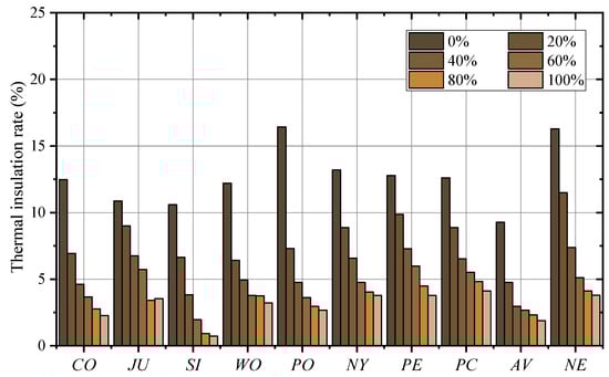 The thermal insulation rate is the percentage of the difference between the heat dissipation with and without the sample to the heat dissipation without the sample. It is related to the thermal conductivity and porosity of the fibers and reflects the ability of the fabric to prevent the loss of body heat. According to the latest textile thermal insulation testing standard GB/T 35762-2017 (Textiles—Test method for thermal transmittance—Flat plate test), the equation for calculating the thermal insulation rate is as follows [26]: