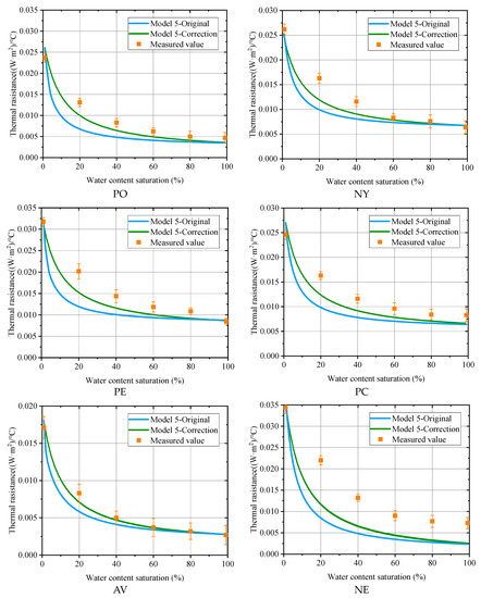 According to the assumptions of the theoretical model (i.e., the voids in the fabric are uniform and constant), the model was revised by using the water content saturation instead of the moisture content to characterize the proportion of water in the fabric system voids. The study compared the fitting relationship between the prediction curve and experimental measurements before and after the revision of Model 5, as shown in Figure 4. From the figure, it can be clearly seen that the prediction curve is generally lower than the measured value, especially when using the original model. The revised model can obtain results closer to the measured value than the original model. Among the 10 sets of revised model prediction curves, 8 sets (80%) had R2 values ranging from 0.95 to 0.99. Only one set of the revised model (NE group) had an R2 value lower than 0.90 (R2 = 0.896), which was higher than the original model (R2 = 0.824) by 0.072. However, this was still higher than the acceptable range of R2 values required by correlation analysis (R2 > 0.8) [30]. It was also found that, especially at low water content saturation levels, the slope of the prediction curve of the revised model was smaller than that of the original model and the downward trend was more gentle, which was in line with the experimental test results. Comparison of the model prediction curve with the experimental results by Mangat et al. [3] also revealed that the original model always underestimated the thermal resistance compared with the actual measurement. Using water content saturation instead of moisture content can effectively improve the prediction accuracy of the model. The experimental results support the applicability of the model in predicting the wet-state thermal resistance of single-layer woven fabrics, indicating a great consistency between the measured and predicted values. Therefore, this study suggests that the revised Model 5 be used as the optimal model for predicting the wet-state thermal resistance of fabrics.