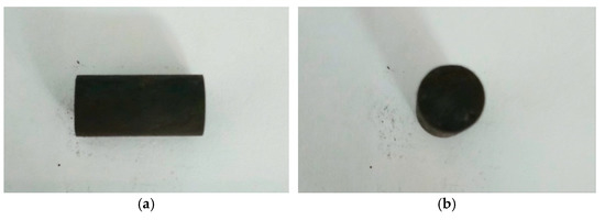 A column sample of Φ3.8 × 8.1 mm was made in the laboratory using the wire-cutting technique along the vertical laminae direction for uniaxial compression and a μ-CT scan experiment (Figure 1). The column sample was polished with sandpaper to make the surface roughness less than 0.02 mm to eliminate the possible end effect of the coal sample during the uniaxial compression test. It is worth noting that in order to avoid the influence of the native voids in the coal samples on the experiments, we deliberately avoided the areas with large voids when processing the coal samples and selected the dense parts of the coal samples for wire cutting. Meanwhile, parallel samples were made from the remaining samples of wire-cutting and the maximum vitrinite reflectance (Ro, max) measurement and maceral composition analysis according to relative standards [35,36]. The industrial components were determined by an SDLA618 automatic industrial analyzer.