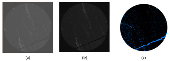 After the raw CT images were median filtered, the image segmentation was performed using an interactive threshold segmentation algorithm. The threshold pixels were set according to the grayscale difference between the pore fracture, coal matrix, and minerals. The image was binarized into the region of interest (ROI) and the background. The binarized image can well reflect the pore-fissure structure information in the coal rock. It can effectively distinguish the pore fissures in the coal sample from the coal matrix and minerals. As shown in Figure 4c, the blue area indicates the pore fracture and the black area indicates the coal matrix and minerals.