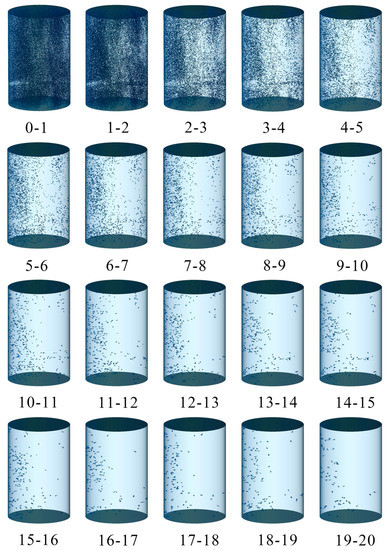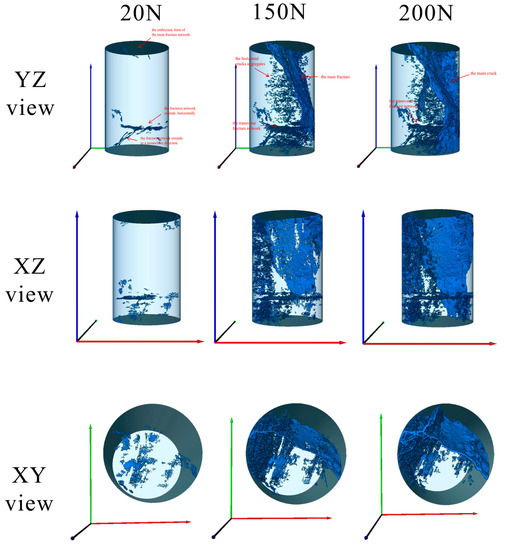 The μ-CT slices were used to perform 3D fracture reconstruction to determine the fracture network. Figure 10 shows the three-dimensional crack network extracted from the sample at axial pressure of 20 N, 150 N, and 200 N. The overall crack propagation process of coal and rock is as follows:
