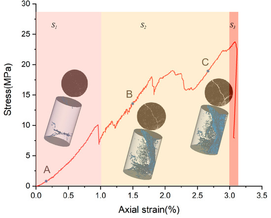 The stress–strain curve of the sample is shown in Figure 7. The compression process can be divided into the microfracture compaction stage (S1), linear elasticity stage (S2), and peak failure stage (S3). From the CT scan results of points A, B, and C, as the axial stress increases, the crack network gradually begins to initiate, develop, and penetrate the sample. During the initial compaction stage (0~1.1% axial strain), the curve is concave, indicating that the rate of stress change is greater than that of strain change; as the axial load increases, the curve falls and then rises again into the linear stage (1.1~3.0% axial strain). The first significant drop in the curve is due to the gradual expansion and connection of local small and medium-sized natural cleats under the stress, resulting in local failure. Large cracks can be observed on the surface of the sample, but due to the redistribution of stress, it still has a large bearing capacity. Afterwards, the line grew approximately linearly, but due to the increase in stress, the pores continued to develop and multi-scale cracks connected with each other, and sharp fluctuations appear in the curve. The main crack continued to propagate until it penetrated the sample, causing the splitting failure and complete loss of its load-bearing capacity, thereby exhibiting strong brittleness characteristics. Through calculation, the failure strength of the sample is 24.58 MPa and the elastic modulus is 6.32 GPa.
