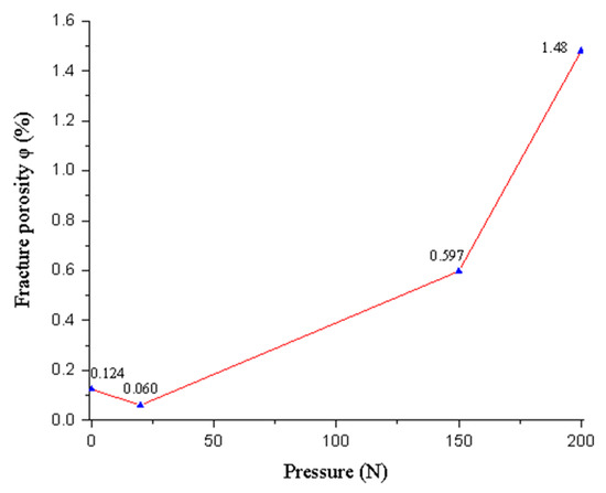The volume and surface area of cracks can reflect their expansion characteristics and using fracture porosity φ as the fracture evaluation index can be used to quantitatively characterize the overall evolution degree of cracks. The calculation formula is