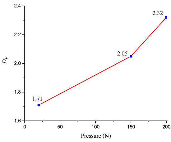 - The fractal dimensions for axial pressures of 20 N, 150 N, and 200 N were 1.71, 2.05, and 2.32, respectively. This means that as the stress increases, cracks begin to concentrate and their size becomes more uneven, which may lead to further fragmentation of the coal rock.