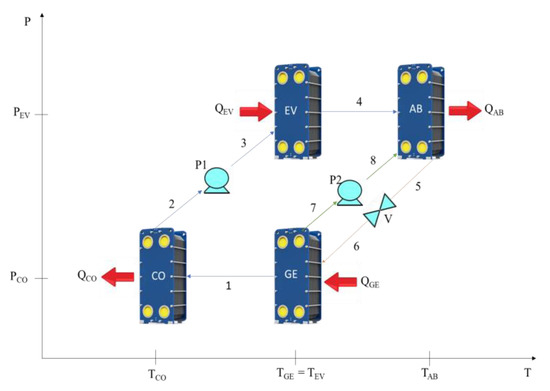 The cycle of an SSHT is shown on a pressure–temperature diagram in Figure 1. It is observed that the SSHT operates with two pressure levels and three temperature levels where the same waste heat is supplied to the Generator and Evaporator. In the case of SSHT and DSHT systems, the working fluid and the absorbent are the water and the aqueous lithium bromide, respectively, which revalue the energy supplied in the Evaporator and Generator.
