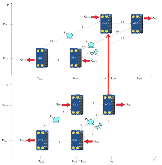 A double-stage AHT is the combination of two single-stage heat transformers, resulting in a device containing a total of 8 heat exchangers, 4 for each stage, as shown in Figure 2.