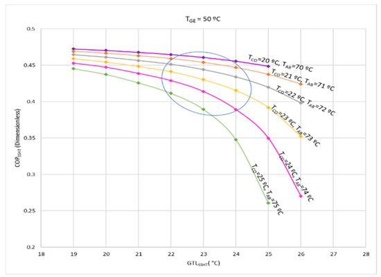 The behavior of the COPSSHT as a function of GTLSSHT for the mixture water–lithium bromide.