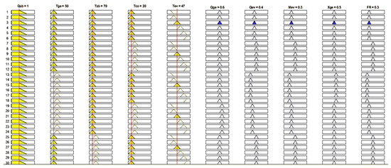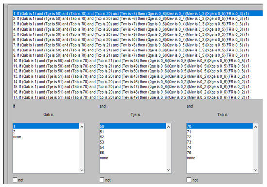 The fuzzy rules base was implemented with the FIS rules editor (Figure 6), which combines the fuzzy values of the input variables with the logical operators AND or OR and the fuzzy inference system, in this case, the method of the t-norm of the minimum. In addition, each rule assigns values to the output variables. Figure 6 shows just a part of the first 17 rules in the FIS rules editor.