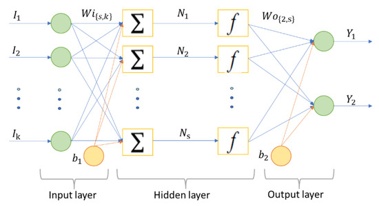 Artificial Neural Networks are made up of four main elements: inputs, synaptic weights, activation function and output. The multi-layer perceptron network configuration or feed-forward is the structure used for an approximation function within supervised learning. The transfer functions used in the different layers and their neurons allow network learning to present linear and nonlinear relationships between input and output variables. Feed-forward networks in their structure present sigmoid functions in the hidden layers and linear functions in the output layer [48]. Figure 7 shows a generic schematic of a basic Artificial Neural Network of a feed-forward type.