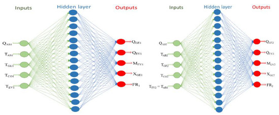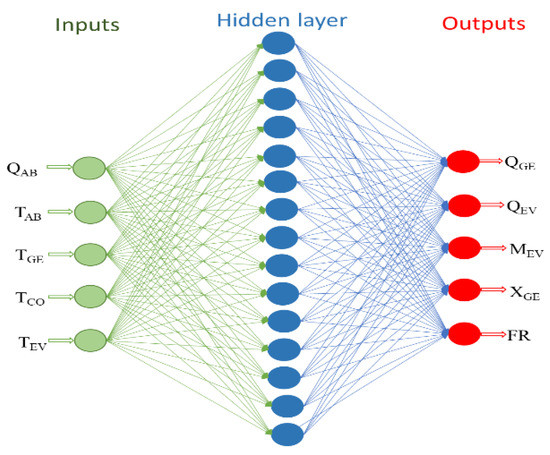 The control strategy that will be implemented to operate the DSHT in the conditions of the higher COP multiplied by GTL product will obtain a value of MEV from the use of Artificial Intelligence. Two AI computer programs were first developed for an SSHT to determine which of the two (Fuzzy Logic and Neural Networks) is more accurate for system stabilization. Figure 4 shows a schematic of the general AI model, which presents 5 input variables defined by a thermodynamic model of the cycle [41] and 5 output variables of interest for the evaluation of QEV, QGE, XGE, FR and MEV, being a MIMO (multiple-input and multiple-output) system. The COP is a function of the powers calculated as outputs of the program, as indicated by Equation (1). The GTL is calculated based on the TAB (which is not fixed); during the calculation process, all temperatures (TEV, TGE, TCO) have a domain or interval of interest that can be assigned. The value of the GTLSSHT will depend on the output values TAB and TEV. Therefore, the GTLSSHT multiplied by COPSSHT product is known for those intervals. The names and units of measurement of inputs and outputs are shown in Table 1.