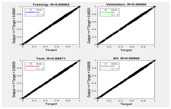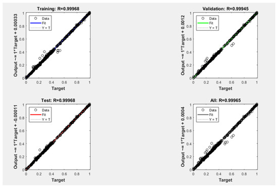 These small MSE values indicate that network performance is good for predicting maximum COP product values per GTL for each operating condition of the input values. Regression plots are also used to validate network performance and show that the fit is reasonably good for all datasets, with regression values (R) in each case greater than 0.999 (Figure 20).