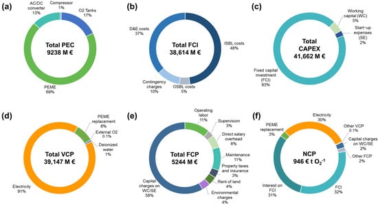 The cost breakdown of all relevant cost categories of purchased equipment costs , total capital expenses , operational costs , as well as the net O2 production costs are presented in Figure 5 for an exemplary case (scenario 1 in 2020, under neutral economic conditions and supplied with PV electricity). The breakdowns shown in Figure 5a to 5e are representative for all other assessed cases, i.e., the proportion of cost items is similar. In all cases, is dominated by the initial PEME investment cost (between 53.2% and 73.4% of for scenario 1 and between 50.7% and 71.5% for scenario 2), followed by the investments for O2 tanks, the converter, and the compressor. The share of made up by PEME investment costs is between 13.2% and 7.5% lower in 2030 than in 2020 due to the assumed decrease in the PEME stack price. , which make up 92.7% of , are dominated by investments inside battery limits (47.8%) and the costs of design and engineering (36.8%).
