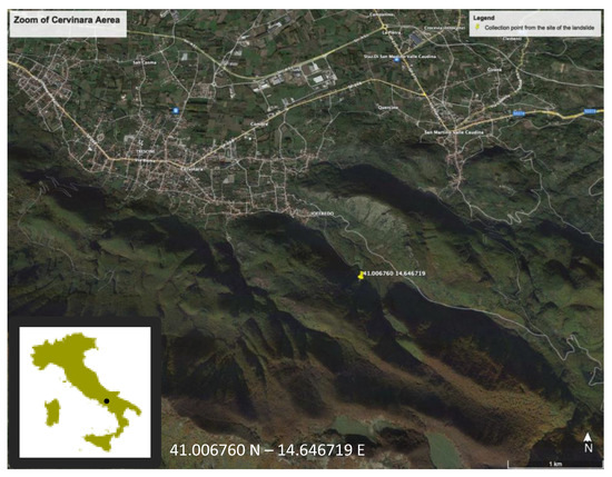 The soil was the same used in our previous works [21,24], and was collected at a depth of 50–80 cm from the surface within a pedological BW horizon, from a slope affected by a catastrophic landslide in 1999 [25] in the Cervinara site (Avellino, South Italy). The coordinates of the collection site are (41.006760°; 14.646719°) and a map showing its position is reported in Figure 1. The soil was stored in a closed vessel after having dried it. This limits the organic carbon degradation over time; however, the rheology of slurries prepared in these years was monitored to be sure that the soil did not evolve over time.