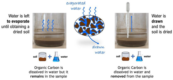 - The soil was suspended in distilled water and left to settle. The clear supernatant water was drawn by a syringe, and the resulting viscous and dense paste was then dried at a temperature that never exceeded 40 °C. The whole soil sample was then gently sieved to 250 μm to break the possible aggregates formed during the previous steps. With this procedure, the organic carbon dissolved in the water is drawn together with the supernatant, thus mimicking the rainwater infiltration/drainage process during which the organic carbon in the water is brought away from the soil. The soil obtained using this method is referred to as “drawn water Snct”: Snct-dr or “drawn water Sdoc”: Sdoc-dr.