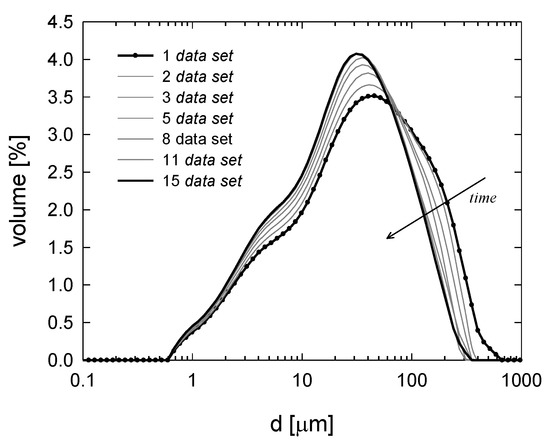 The soil samples were gently added to the water, which was stirred at a constant velocity of 1500 rpm. In diffractometric measurements, the water suspension must be rather transparent, and a light obscuration percentage of about 10% to 20% is typically considered suitable. In our measurements, all the tests started from the same obscuration of about 15%; to this end, 0.1–0.3 g of soil were typically added to 400 mL of bi-distilled water. As the timing of the experiment was a crucial parameter in these non-conventional tests, the whole loading step lasted exactly 30 s for all the samples. Upon loading, the evolution of the particle size distribution was followed over time for 13.4 min by averaging data recorded each 53 s. During these 53 s, the sample is lit by a red laser for 20 s, and by a blue laser for 30 s; the remaining 3 s were due to instrument internal procedures. The diffraction theory of Mie was used to obtain the particle dimensions. We thus recorded 15 sets of data that described the time evolution under the constant stirring condition of the particle size distribution, as shown in Figure 3 as an example. The stirring flow breaks some larger particles (soil macroaggregates), thus increasing the quantity of smaller ones (soil microaggregates). According to the hierarchical theory of aggregation of soil, the microaggregates form the macroaggregates, thanks to the cohesive forces mainly due to DOC. The evolution of the particle size distribution was thus affected by the amount of DOC effectively binding together the microaggregates.